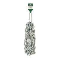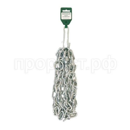 Стальная сварная будочная цепь с коротким звеном, вертлюгом и карабином. По сравнению с длиннозвенной цепью обладает большей прочностью, но меньшей подвижностью звеньев. Производится из углеродистой стали и обрабатывается цинком гальваническим методом. Диаметр сечения звена 6мм.