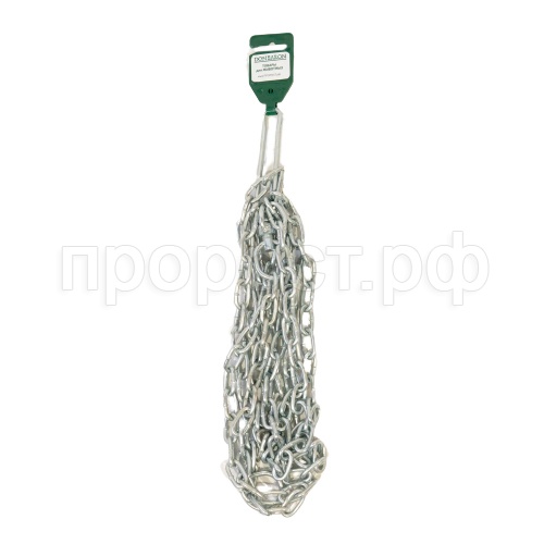 Стальная сварная будочная цепь с коротким звеном, вертлюгом и карабином. По сравнению с длиннозвенной цепью обладает большей прочностью, но меньшей подвижностью звеньев. Производится из углеродистой стали и обрабатывается цинком гальваническим методом. Диаметр сечения звена 4мм.
