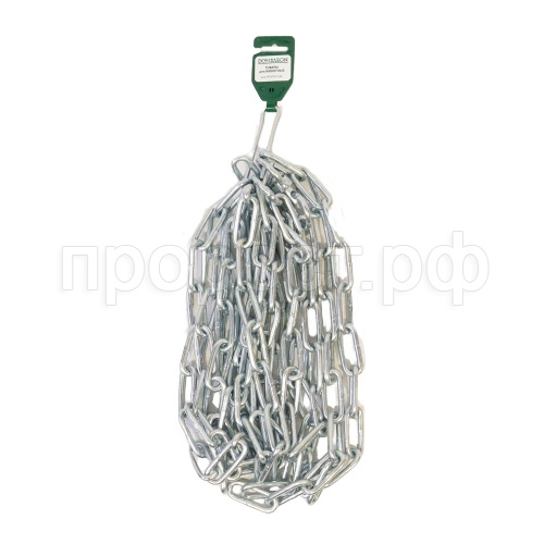 Стальная сварная будочная цепь с длинным звеном, вертлюгом и карабином. Производится из углеродистой стали и обрабатывается цинком гальваническим методом. Диаметр сечения звена 6мм.