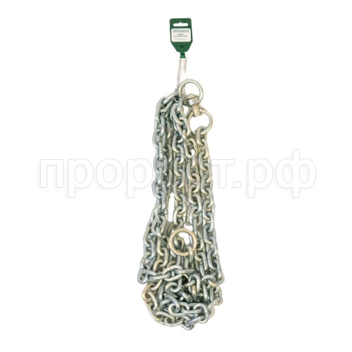 Стальная сварная будочная цепь с коротким звеном, вертлюгом и карабином. По сравнению с длиннозвенной цепью обладает большей прочностью, но меньшей подвижностью звеньев. Производится из углеродистой стали и обрабатывается цинком гальваническим методом. Диаметр сечения звена 8мм.