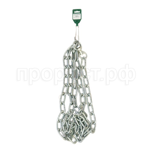 Стальная сварная будочная цепь с длинным звеном, вертлюгом и карабином. Производится из углеродистой стали и обрабатывается цинком гальваническим методом. Диаметр сечения звена 7мм.
