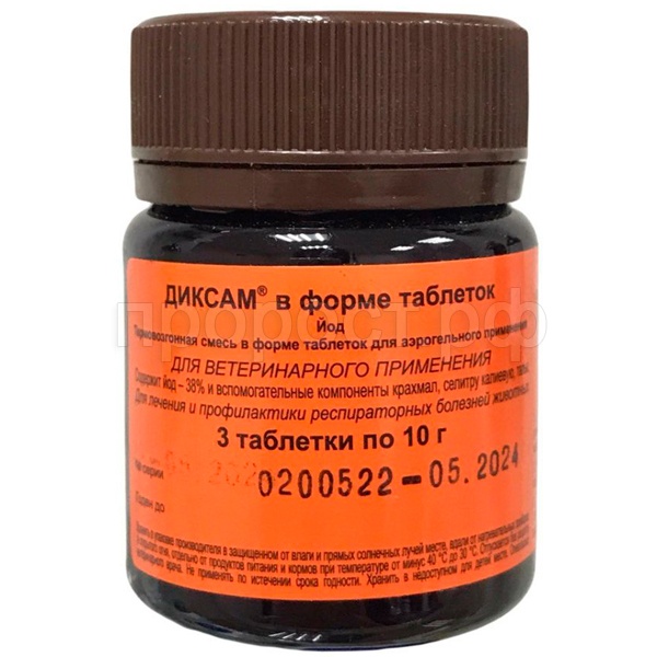 5.Животные доступны для заказа самовывозом из сети зоомаркетов "ПРОРОСТ". Питомцы не доставляется транспортной компанией.При проведении обработки расчётное количество Диксама размещают в нескольких местах на поверхности пола, на несгораемых подставках (кирпич, бетон и т.д.) по 3-10 таблеток в одном месте, размещённых вертикально одна над другой. Поджигают при помощи бытовой спички. Время сгорания одной таблетки составляет 10-12 секунд, 10 таблеток 25-30 секунд. При сгорании образуются пары йода от светло-коричневого до фиолетового цвета. Равномерное распределение паров по объему помещения происходит за счёт конвекционных потоков воздуха. При инфекционных и незаразных респираторных заболеваниях (ларинготрахеит, инфекционный бронхит, аспергиллёз, инфекционный ринотрахеит, бронхит и бронхопневмония телят и поросят) обработку проводят один раз в 2 дня. Концентрация паров йода должна составлять 20 мг/м3. Всего проводят 3-4 обработки. Экспозиция 20-30 минут.